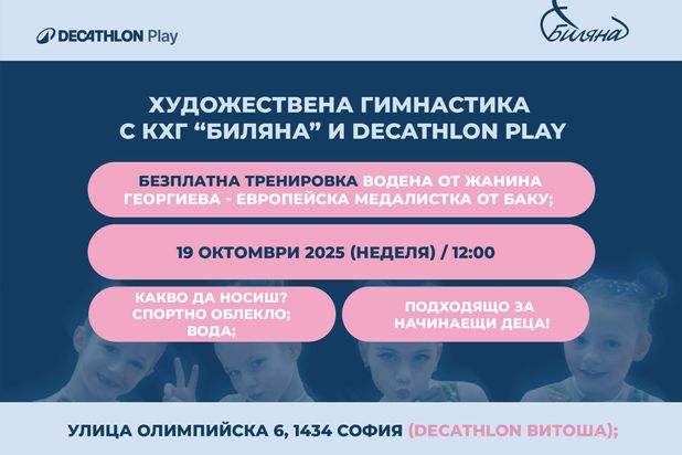 🎀 ДЕН НА ОТВОРЕНИТЕ ВРАТИ – ХУДОЖЕСТВЕНА ГИМНАСТИКА 🎀 с КХГ „БИЛЯНА“ Заповядайте на безплатна тренировка по художествена гимнастика, водена от невероятната Жанина Георгиева – европейска медалистка от Баку! 🤸♀️✨ Ще се забавляваме, ще учим нови движения и ще споделим любовта към гимнастиката заедно с отбор „Маймуни“ (София Калчева, Мила Илиева, Елина Жако-Прео, Зара Петрова)! 🐒💜 📍 Къде: Decathlon Витоша – ул. Олимпийска 6, 1434 София 🗓 Кога: 19 октомври, от 12:00 ч. 💫 Вход свободен! Елате с добро настроение и спортен дух – очаква ви вдъхновяващо преживяване за малки и големи любители на художествената гимнастика! 💕